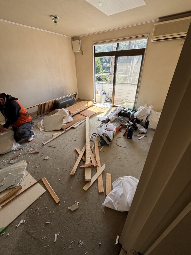 リビング部分では、既存の床材を撤去し、下地の状態を確認する作業から始まりました。