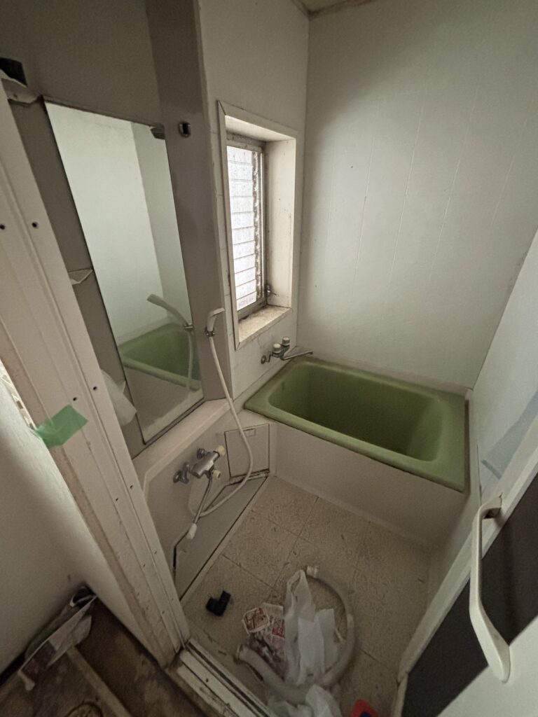 淡いグリーンの浴槽が使用されていた浴室は、典型的な昭和後期から平成初期の仕様でした。